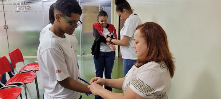 Entrega das pulseiras – Os comitês receberam pulseiras para serem identificados e facilitarem o diálogo com outros alunos sobre o tema.