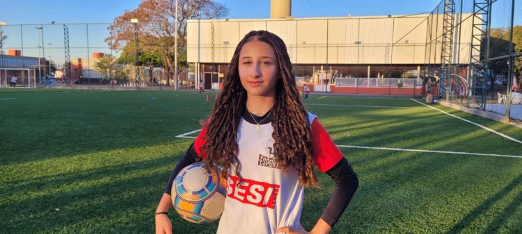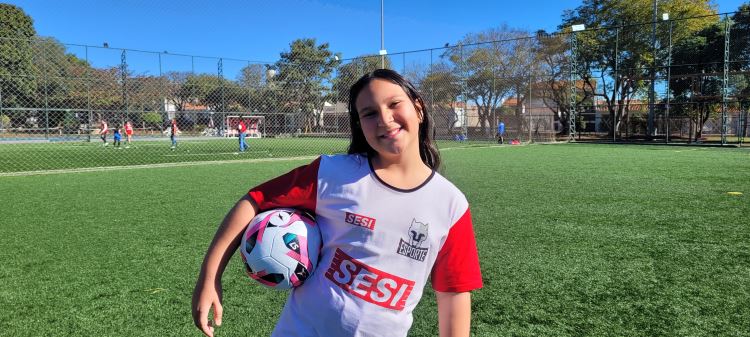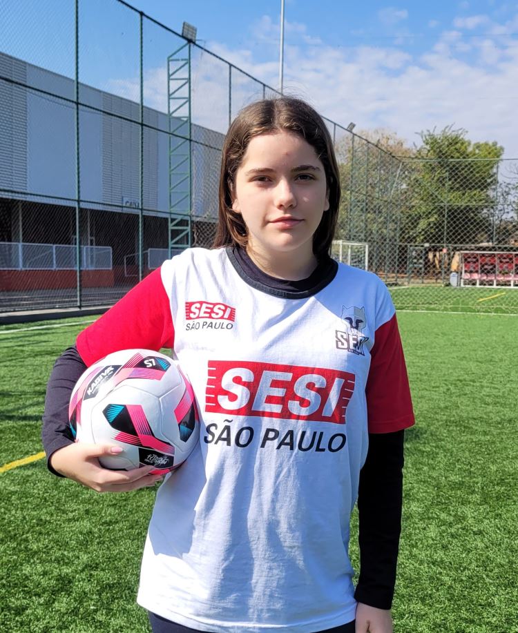 Giovanna começou no SESI há apenas quatro meses, mas o futebol já faz parte da sua vida há muito tempo. Apaixonada pelo esporte, ela costumava jogar com os meninos e nunca perdeu a vontade de competir e se divertir. Não sonha em ser profissional, mas valoriza cada momento em quadra com as amigas. Mesmo sem o incentivo da mãe, que prefere que ela siga outros caminhos, Giovanna persiste, porque sabe que o futebol é alegria e faz bem para sua vida.